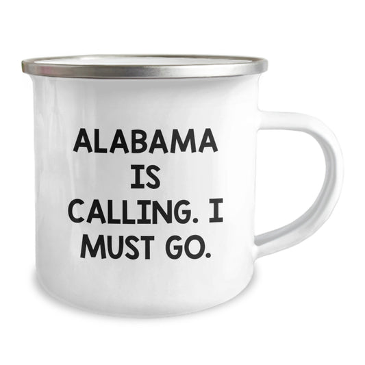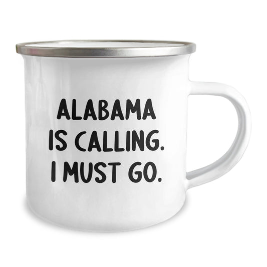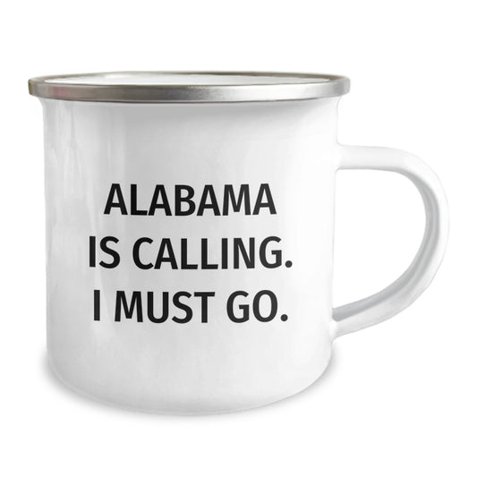 Alabama Camping Mug, 'Alabama Is Calling. I Must Go.' Funny Quote, Gifts from Friends for Birthday, 12 oz Stainless Steel with Enamel Finish