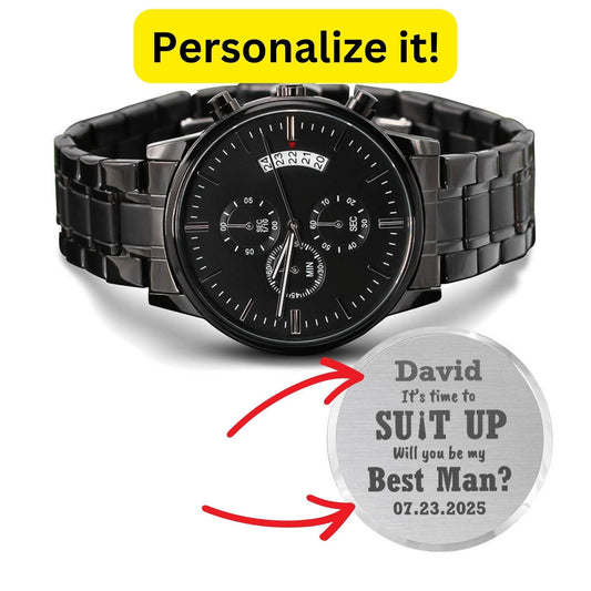 Best Man, Groomsman Wedding Proposal Custom Engraved Chronograph Wristwatch It's Time To Suit Up Will You Be My