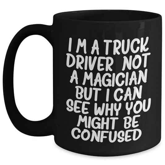 Funny Truck Driver Gifts From Men To Truck Driver Friends - Black Coffee Mug 'I'm A Truck Driver. Not A Magician...'