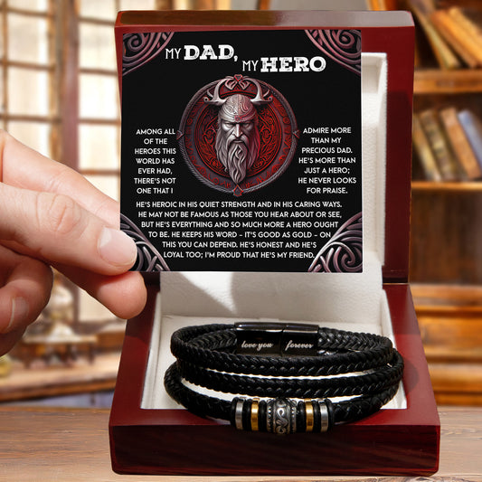 To My Dad, My Hero - Father's Day, Birthday Gift for Dad - Men's Vegan Leather Bracelet with Viking Quiet Strength Message Card