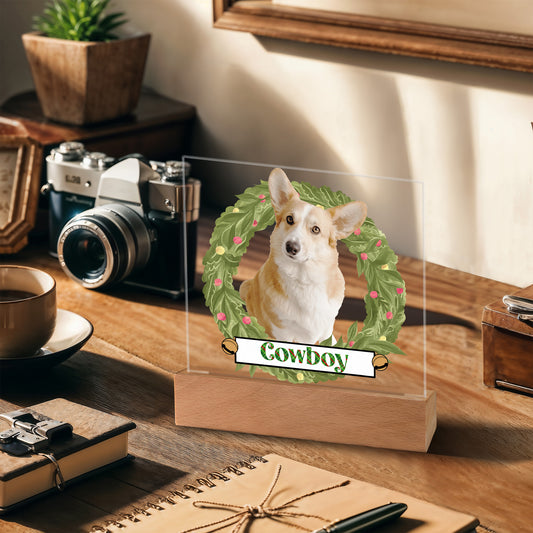 Pet Personalized Holiday Wreath Photo Upload Keepsake Acrylic Plaque with Lighted LED Wooden Base