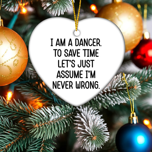 Funny Dancer Gifts from Friends - I Am A Dancer. To Save Time Let's Just Assume I'm Never Wrong. Heart Ornament, White, Christmas Unique Gifts for Dancer
