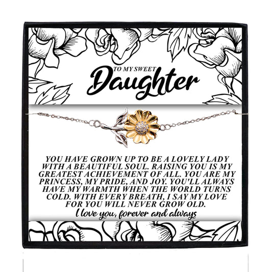 To My Sweet Daughter – You’ll Always Have My Warmth When the World Turns Cold – Sunflower Bracelet Gift from Mom or Dad with Message Card