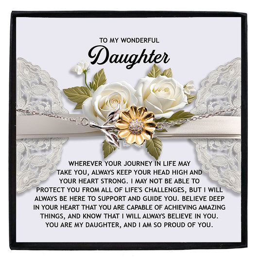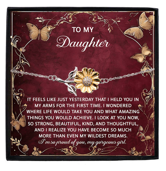 Daughter Sunflower Bracelet Sterling Silver with 18K Gold-Plated Petals – Inspirational Birthday Graduation Christmas Gift from Parent –Proud of You Heartfelt Message Card