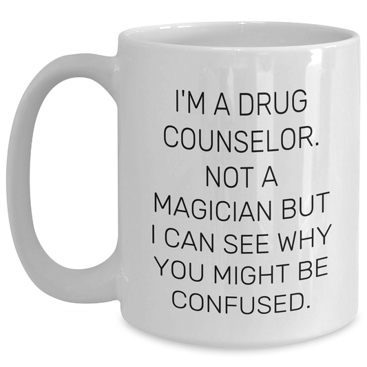 Funny Quote Drug Counselor Gifts from Family for Drug Counselor Graduation White Coffee Mug, I'm A Drug Counselor. Not A Magician But I Can See Why You Might Be Confused., 11oz or 15oz Capacity