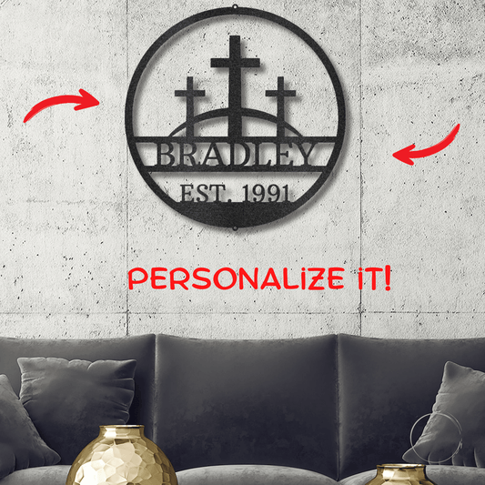 Three Crosses Personalized Metal Wall Art – Custom Family Name Christian Decor – 5 Sizes & Finishes – Made in the USA