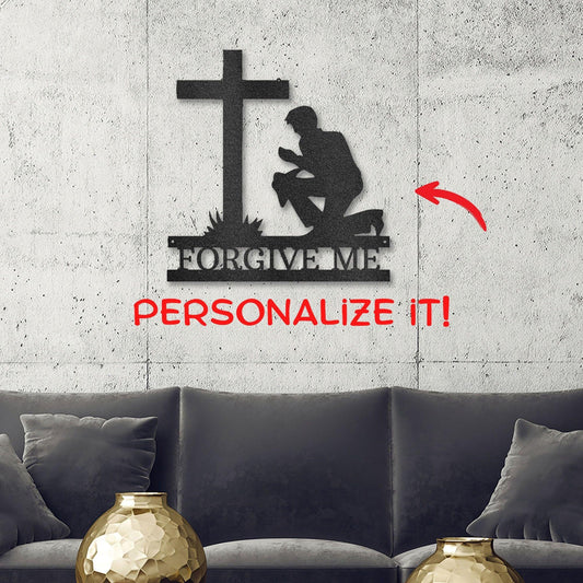 Praying Man Kneeling at Cross Spiritual Metal Art Wall Sign