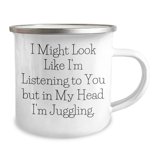 Juggling Enthusiast Funny Camping Mug, Gifts from Friends for Juggling Lovers on Father's Day, 'I Might Look Like I'm Listening'
