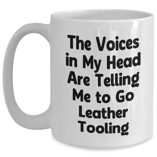 Funny Leather Tooling Gifts from Friends to Men - Black Coffee Mug for Father's Day, 'The Voices In My Head Are Telling Me To Go Leather Tooling' Quote