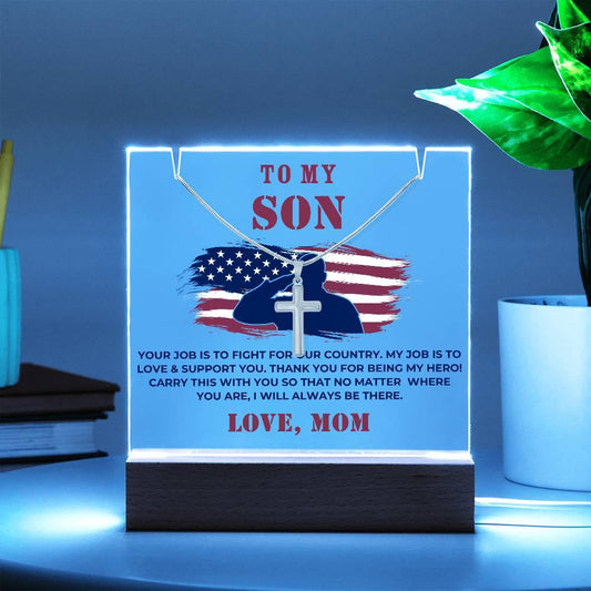 Military Son Cross Necklace and Acrylic Plaque - Your Job is to Fight for our Country