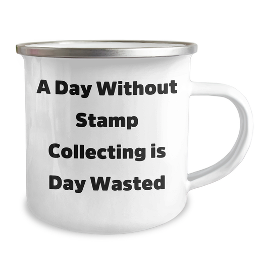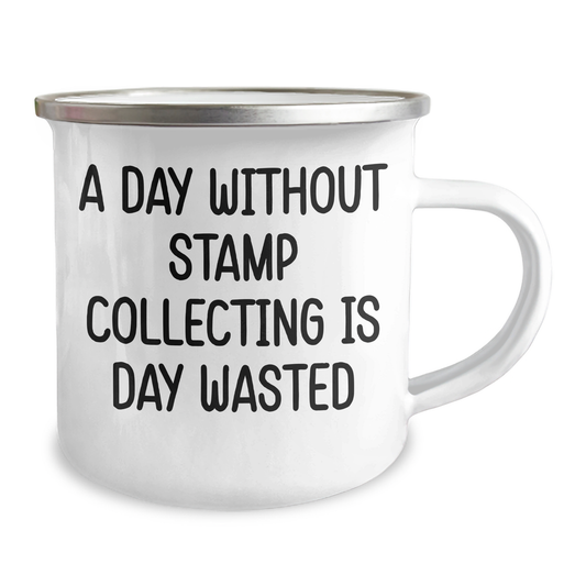 Funny Stamp Collecting Gifts from Men for Father's Day - 'A Day Without Stamp Collecting Is Day Wasted' Camping Mug, 12 oz Stainless Steel with Enamel Finish