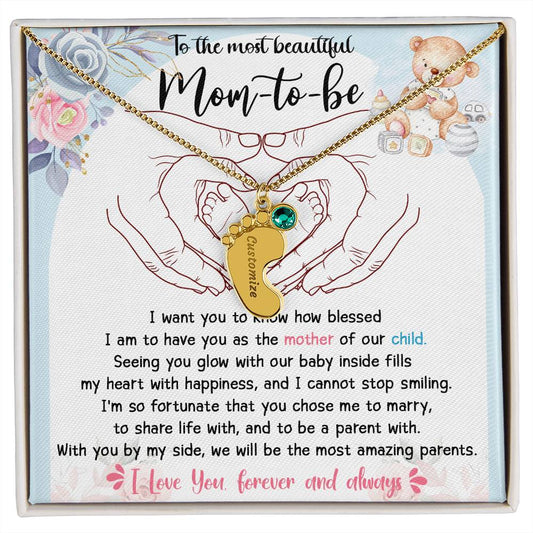 Mom-to-be Gift from Husband Engraved Name Baby Feet Charm Necklace with Birthstone