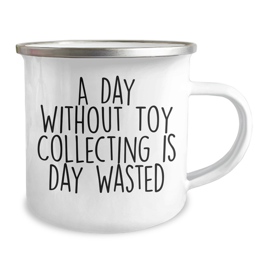 Funny Toy Collecting Camping Mug, Gifts from Men to Friends for Father's Day, 'A Day Without Toy Collecting Is Day Wasted' Quote, 12 oz Stainless Steel with Enamel Finish