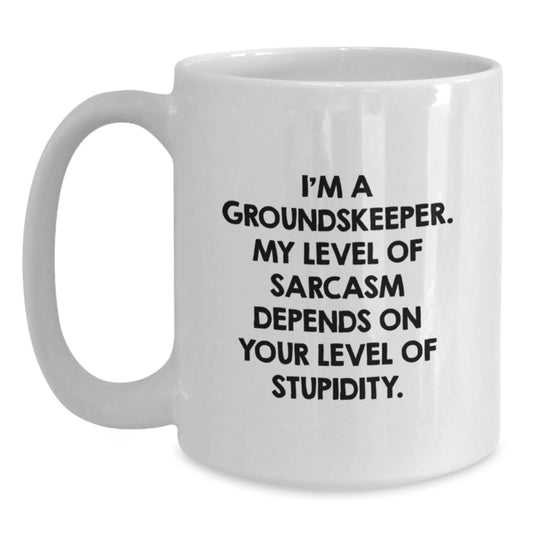 Funny groundskeeper Gifts from Men to groundskeeper Friends, White Coffee Mug, 'I'm A groundskeeper. My Level Of Sarcasm Depends On Your Level Of Stupidity.'