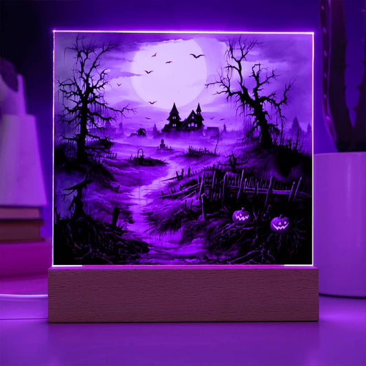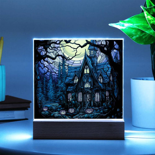 Eerie Elegance: Haunted Mansion Acrylic Halloween Plaque with LED Lighted Wooden Base