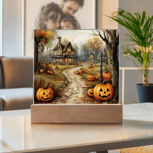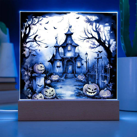 Spooky Halloween Mansion Acrylic Square Plaque with LED Lighted Wooden Base