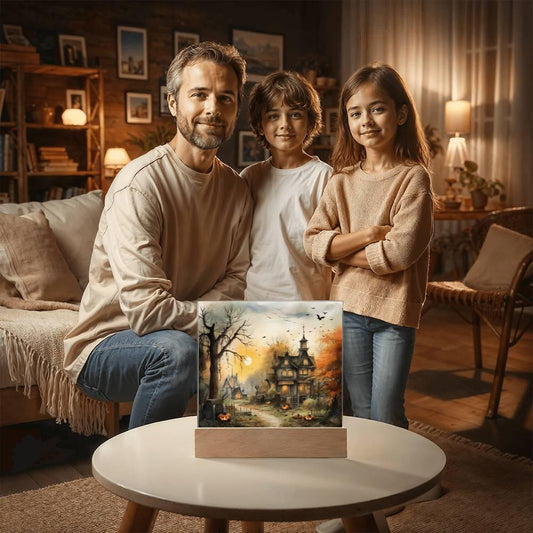 Spectral Spire: Spooky Halloween Mansion Acrylic Square Plaque with LED Lighted Wooden Base