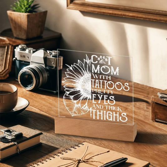 Cat Mom with Tattoos Acrylic Square Plaque with LED Wooden Base