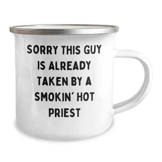 Funny Priest Gifts, Sorry This Guy Is Already Taken, 12 oz Camping Mug, Fathers Day Unique Gifts from Men to Friends