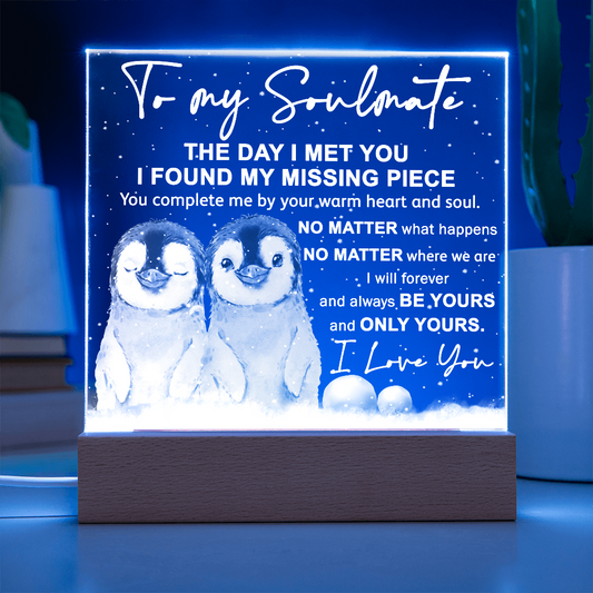 Soulmate Acrylic Plaque – Penguin Couple LED Light Gift | Romantic “You Complete Me” Christmas Keepsake