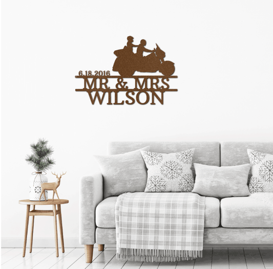 Motorcycle Cruising Couple Custom Mr & Mrs Metal Art Wall Sign
