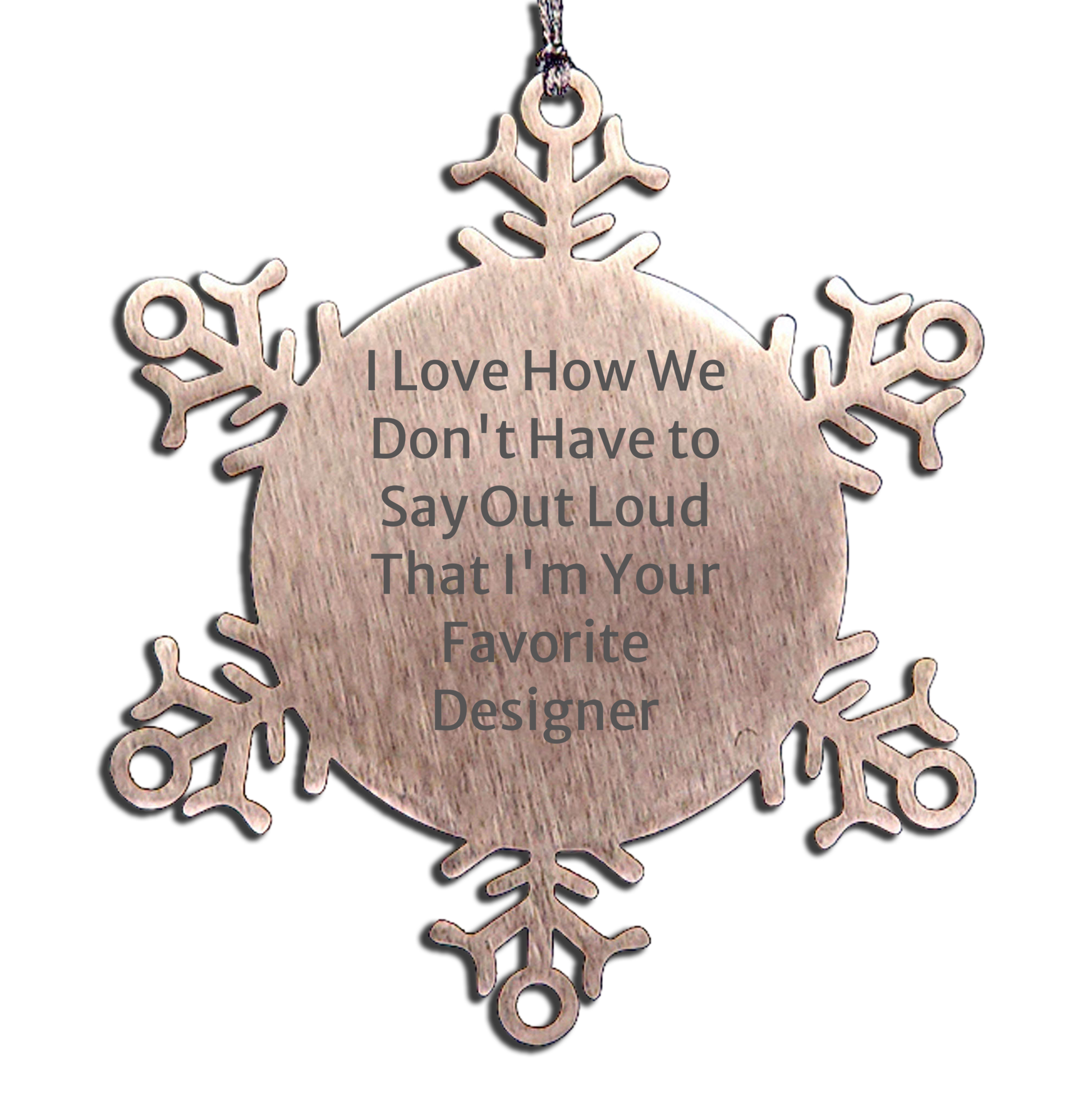 Bring a touch of elegance to your home with this beautiful Designer Snowflake Ornament, featuring the playful quote, “I Love How We Don’t Have To Say Out Loud That I’m Your Favorite Designer.” Crafted from premium stainless steel, this shatterproof ornament is both durable and safe, measuring 3.14 inches in diameter—perfect for any Christmas tree or winter decor. Whether for a fellow design enthusiast or a loved one, its intricate details and quality materials make it a standout piece that’s sure to bring a smile. A charming and thoughtful gift for anyone who appreciates great design, it’s ideal for adding style to a room or office and will be cherished for years. Make this holiday season unforgettable with this unique, one-of-a-kind ornament.