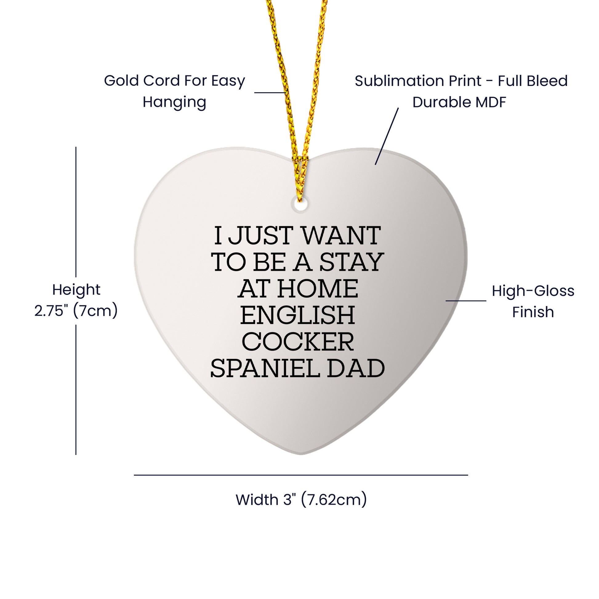This beautiful heart ornament is perfect for pet owners who proudly say, "I Just Want To Be A Stay At Home English Cocker Spaniel Dad." Its bright and colorful design adds charm to your Christmas décor, while its sturdy MDF construction ensures it lasts for years. Lightweight and durable, it’s a great addition to any tree or mantel, even in homes with kids or pets. Brighten your loved ones’ holidays with this delightful English Cocker Spaniel ornament!