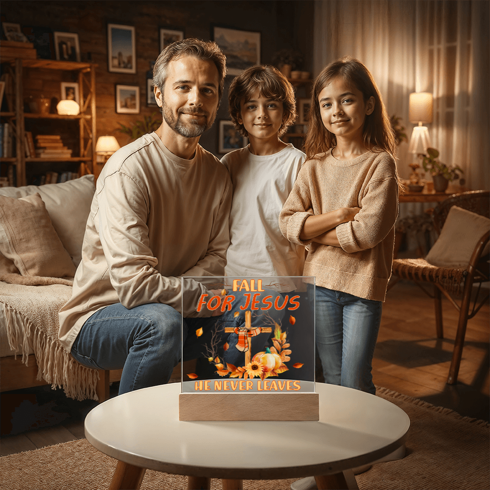 Celebrate faith and fall together with this inspiring “Fall for Jesus – He Never Leaves” acrylic plaque. Featuring a radiant cross wrapped in an autumn scarf surrounded by pumpkins, sunflowers, and falling leaves, this design beautifully blends the warmth of the season with the steadfast love of Christ.