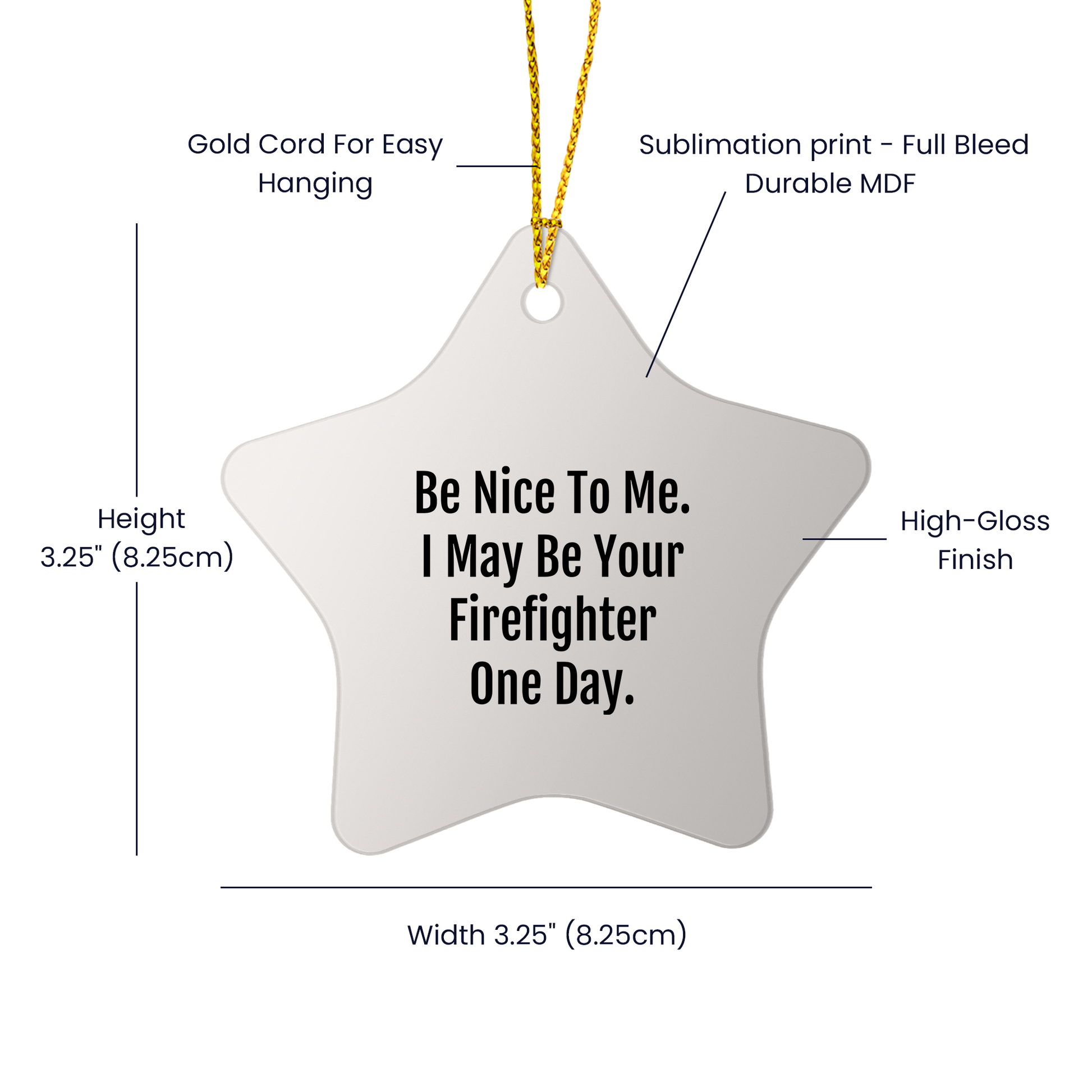 If you’re a Firefighter enthusiast or know a local hero, this Star Ornament makes the perfect gift. Featuring the playful quote “Be Nice to Me. I May Be Your Firefighter One Day,” it’s sure to spark a smile and fill hearts with pride. Crafted from durable MDF with a glossy plastic finish, it’s a charming addition to any home or office. Ideal for Christmas or any special occasion, it’s a thoughtful way to show appreciation for the brave men and women who keep us safe. With a festive gold cord for easy hanging and vivid colors that bring warmth and cheer, this ornament is both decorative and meaningful—a keepsake to be cherished for years.