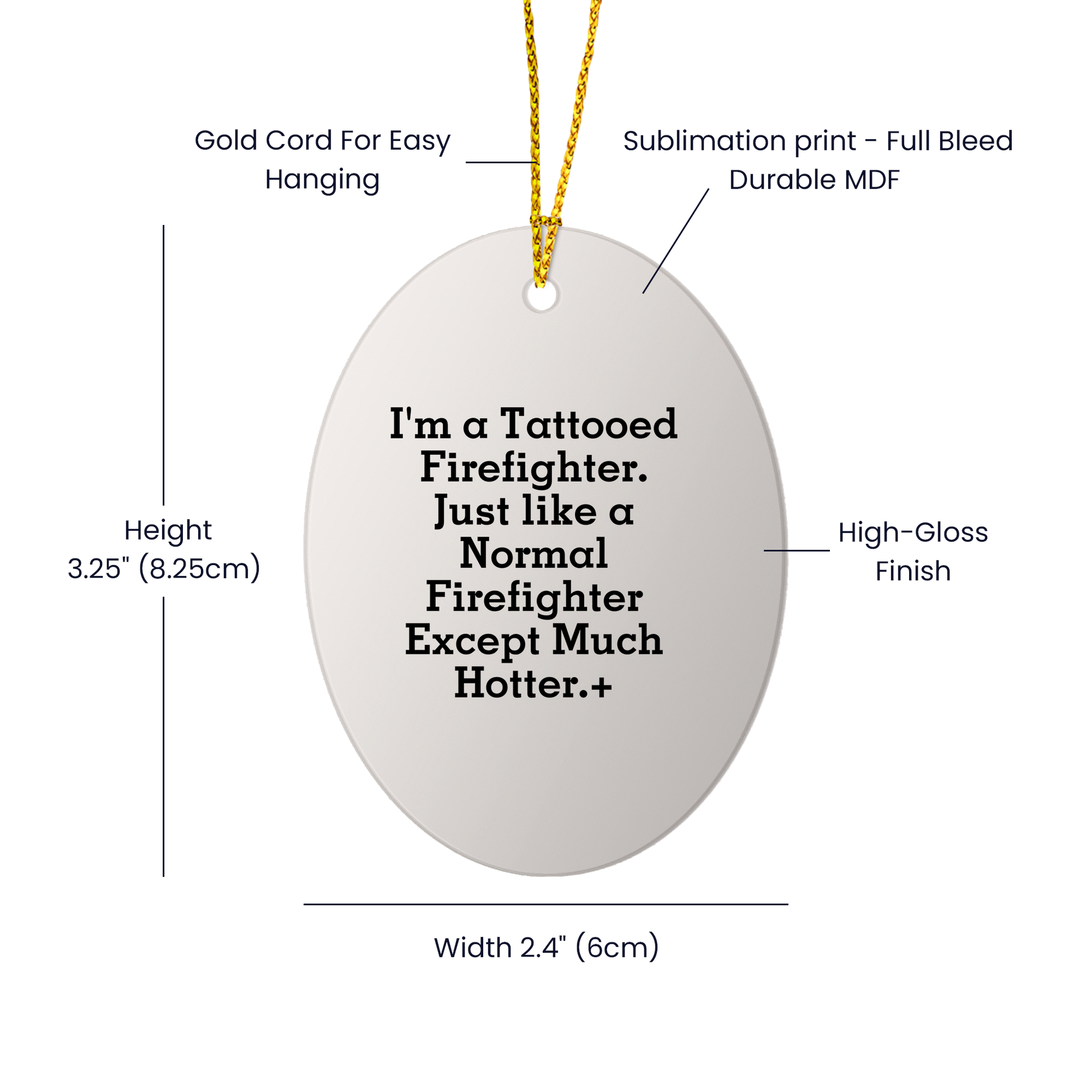 If you’re searching for a unique gift for the firefighter in your life, the Funny Firefighter Oval Ornament is a perfect choice. Crafted from durable MDF with a glossy plastic finish, it’s lightweight, break-resistant, and ideal for homes with kids or pets. Featuring the bold quote, “I’m A Tattooed Firefighter. Just Like A Normal Firefighter Except Much Hotter.” printed edge-to-edge via sublimation for vibrant colors, it also comes with a festive gold cord for easy hanging. Whether you love the humor, admire tattoos, or just want something quirky, it’s a fun way to celebrate the holidays. Thoughtful and personal, it’s a great way to show appreciation for firefighters’ bravery and selflessness, making it a standout gift for Christmas or any special occasion.