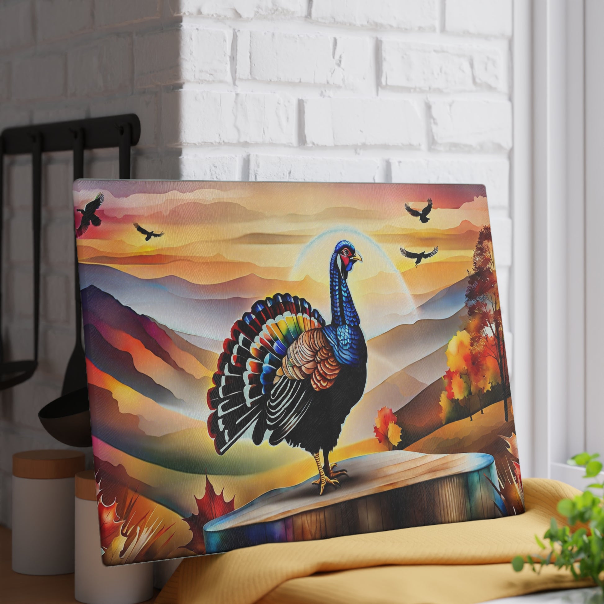 Glass Cutting Board — Colorful Turkey Sunset Kitchen Cutting Board, Autumn Farmhouse Décor