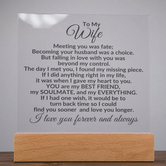 When words are not enough, let this gift do the talking for your fantastic wife. The plaque reads: To My Wife, Meeting you was fate; Becoming your husband was a choice. But falling in love with you was beyond my control. The day I met you, I found my missing piece. If I did anything right in my life, it was when I gave my heart to you. YOU are my BEST FRIEND, my SOULMATE, and my EVERYTHING. If I had one wish, it would be to turn back time so I could find you sooner and love you longer. I love you forever and always,