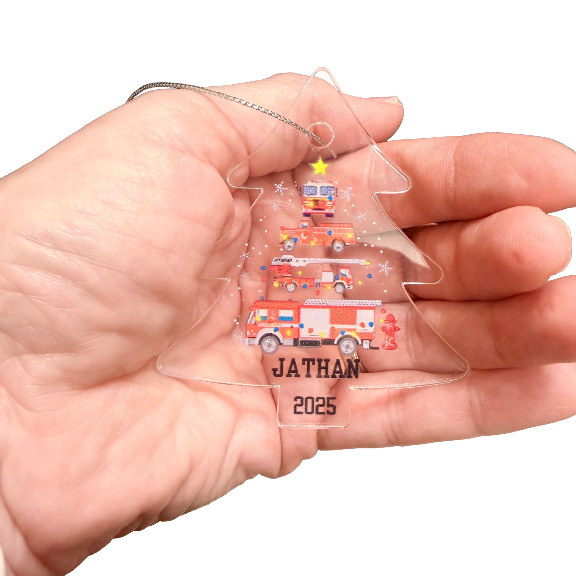Crafted from premium clear acrylic with a festive Christmas-tree silhouette, this ornament features a playful stack of colorful fire engines, holiday lights, snowflakes, and a shining star topper. Add your custom name and year to create a keepsake that celebrates your child's love of fire trucks—or honors a special firefighter in your life.