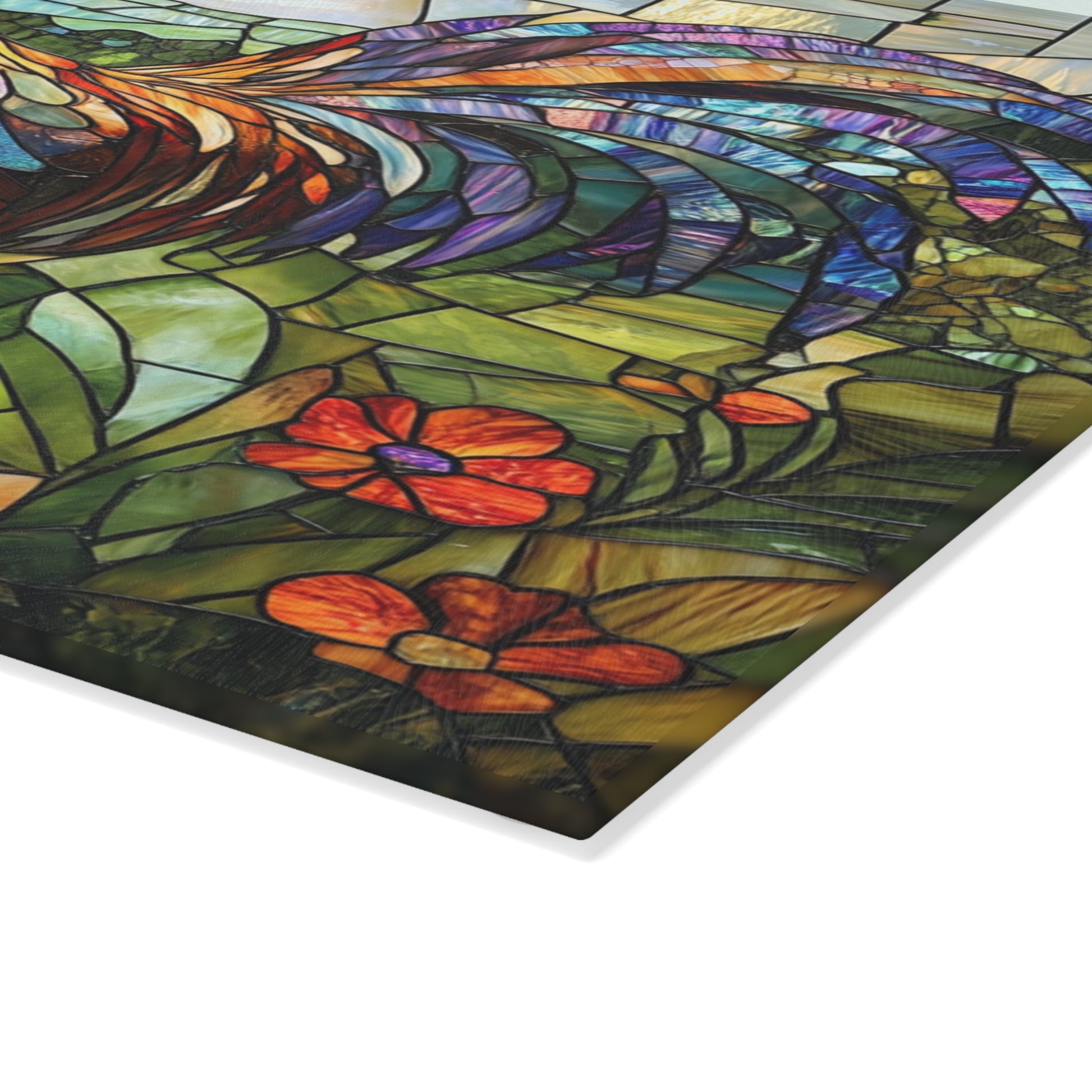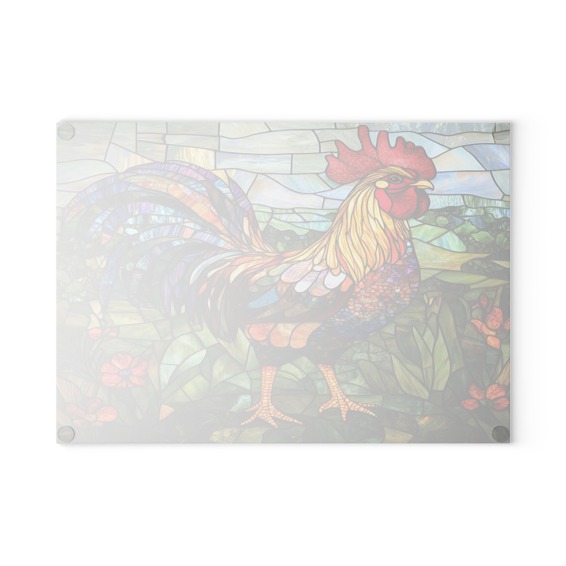 This tempered glass cutting board brings stained-glass charm to everyday kitchen tasks. A proud, colorful rooster stands amid lush foliage — every feather and blossom rendered in crisp, vibrant print that resists scratching even with knife use. The textured glass surface feels cool and sanitary under hands, while four small rubber feet hold the board steady on counters. Available in two sizes, it slides easily into prep routines or rests as a decorative surface between uses. Hand-wash to keep colors bright and the print pristine.