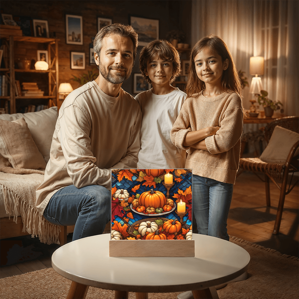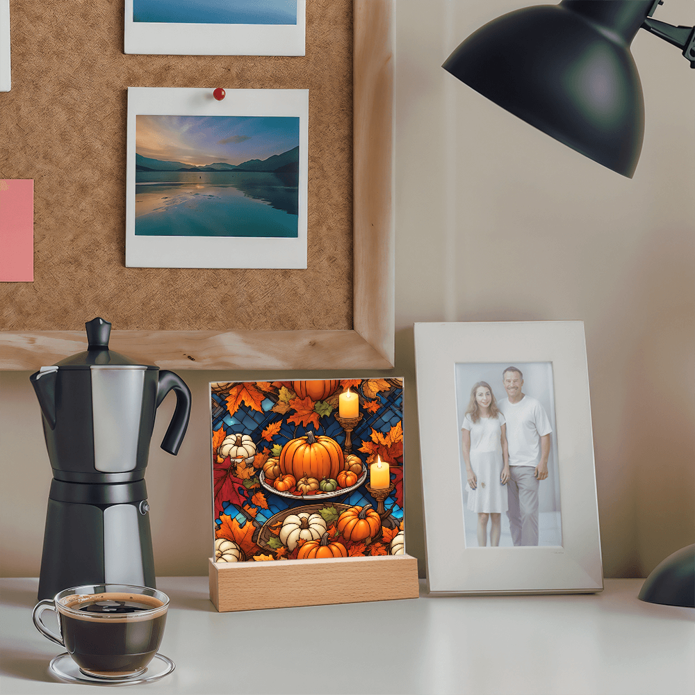Create a cozy harvest glow with this Stained Glass Pumpkin & Candle Acrylic Plaque, a luminous tribute to autumn’s beauty. The design features golden candles, pumpkins of every shade, and cascading fall leaves in a brilliant stained-glass style that radiates warmth and gratitude.