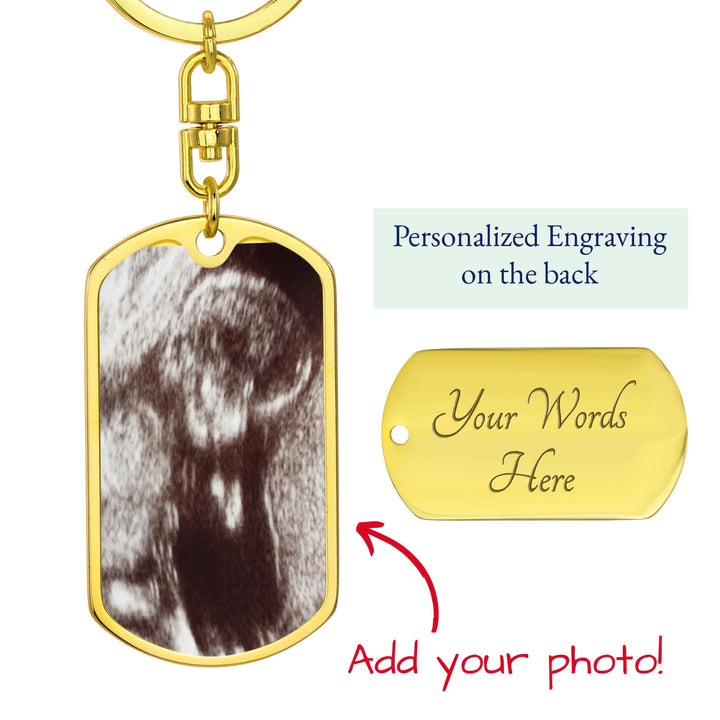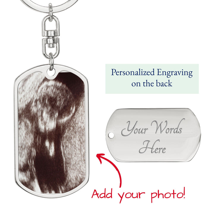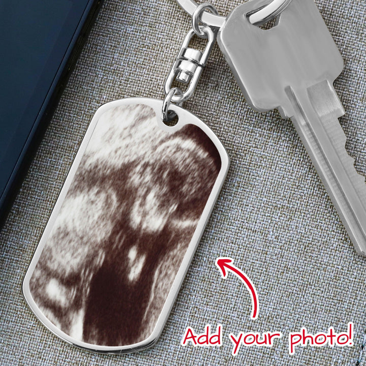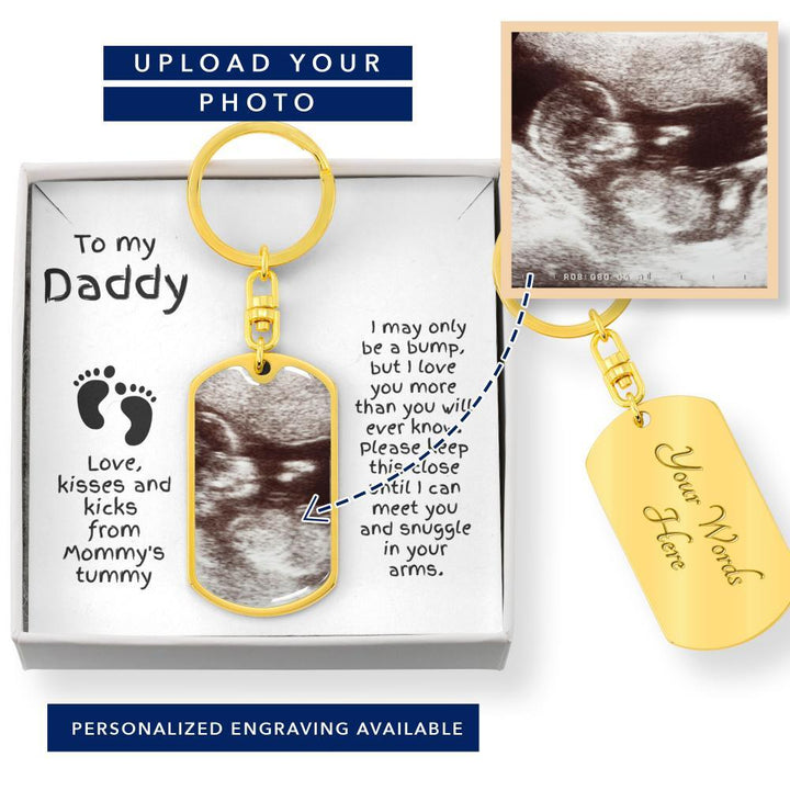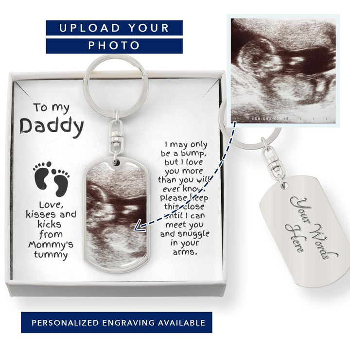 Perfect gift for the "expectant dad." Upload the ultrasound photo and engrave the back of the keychain. Message card reads: To my Daddy, I may only be a bump, but I love you more than you ever know. Please keep this close until I can meet you and rest in your arms. Love, kisses, and kicks from Mommy's tummy