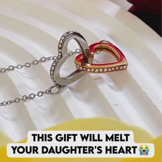 Give your daughter a timeless and heartfelt keepsake that symbolizes your unconditional love and endless pride. This Interlocking Hearts Necklace represents the unbreakable bond between parent and child, featuring two elegantly intertwined hearts—one in high-quality polished surgical steel, the other in a rose gold or 18K yellow gold finish. Sparkling cubic zirconia accents add a brilliant touch, making this necklace as radiant as the love you share.