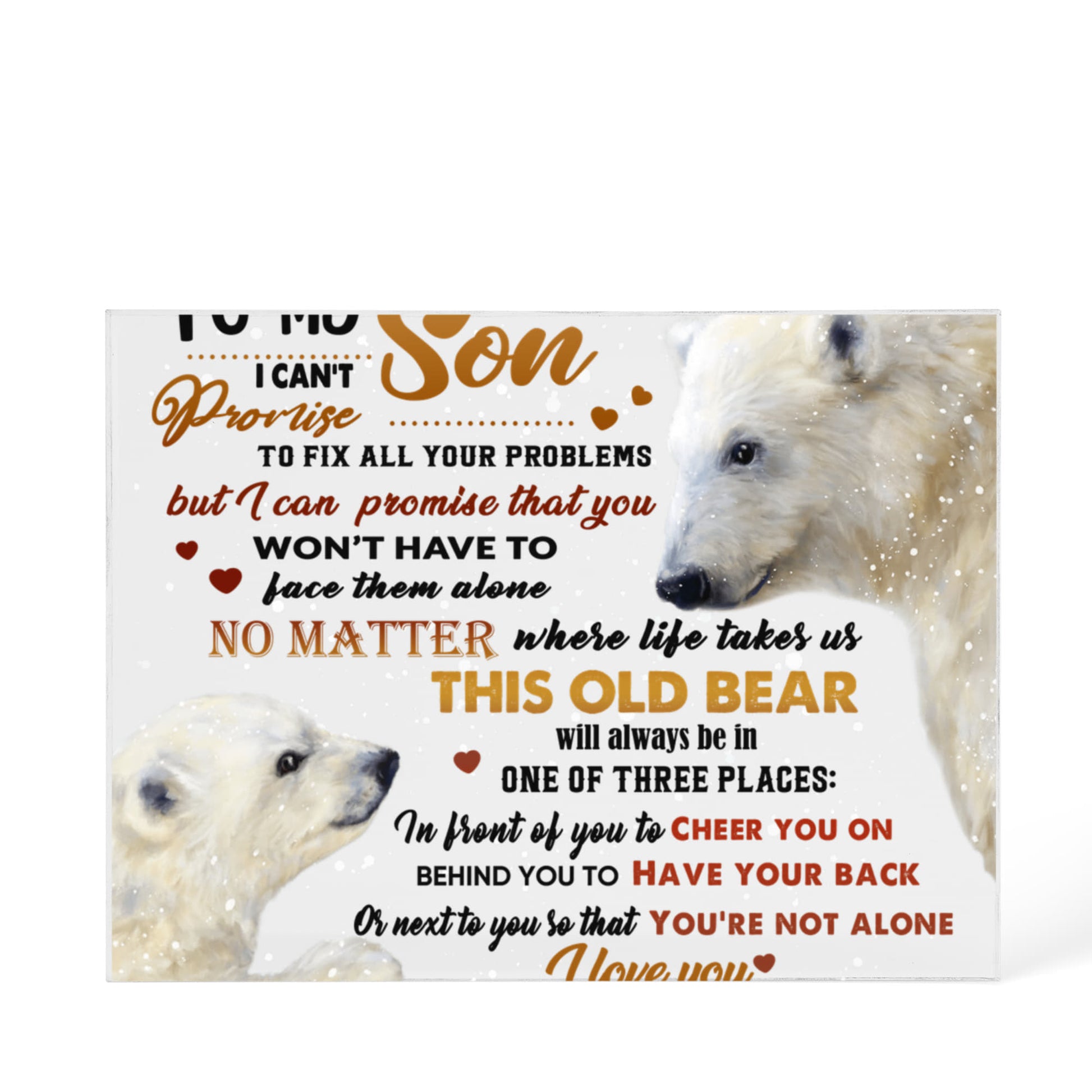 Give your son a gift that carries warmth, wisdom, and strength with this “To My Son – This Old Bear” Acrylic Block. Featuring a tender polar bear and cub design, this solid crystal-clear acrylic piece symbolizes a father’s unwavering love and protection — no matter how far apart life takes you.