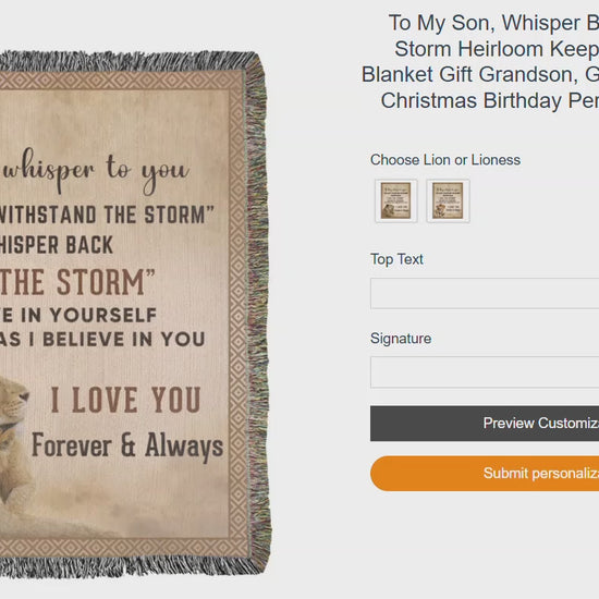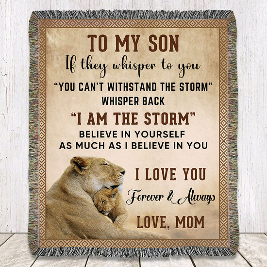 A beautiful gift for your son to cherish, this heirloom woven blanket has a message that speaks from your heart, "To my Son, If they whisper to you, you can't withstand the storm, whisper back I AM THE STORM. Believe in yourself as much as I believe in you. I love you forever and always, Love, Mom."