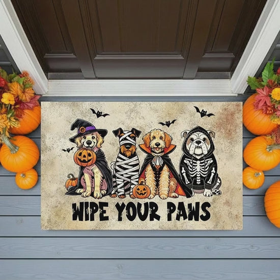 Welcome guests (and their paws!) with a touch of Halloween charm. This Wipe Your Paws Doormat features four adorable dogs dressed for the spooky season — a witch, mummy, vampire, and skeleton — surrounded by pumpkins and bats. It’s the perfect way to combine humor, holiday spirit, and a love for dogs in one festive entryway accent.